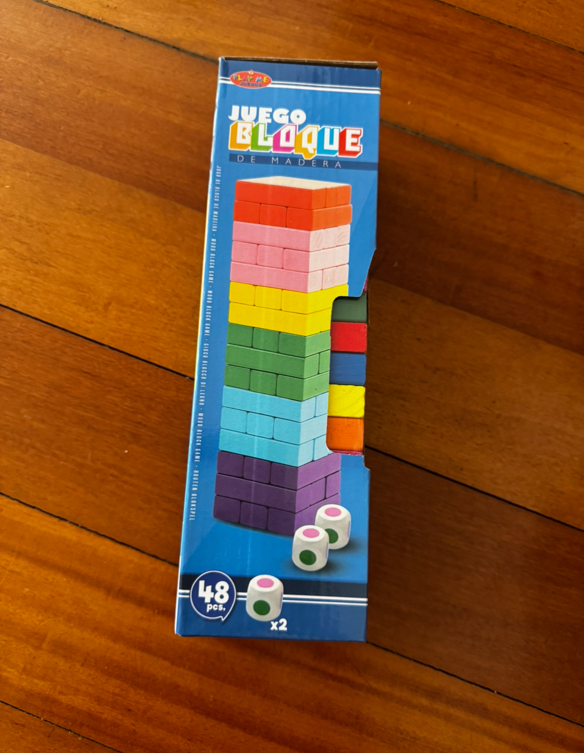 Colored Jenga (Dice Variant) is a dexterity and stacking game where players take turns removing blocks from a tower and placing them back on top without causing it to collapse. Unlike classic wooden tower game, this version adds a die with six colors that determines which color block the player must remove on their turn.