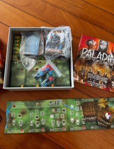 Paladins of the West Kingdom is a worker placement and engine-building game set in medieval Europe, where players defend their city from outside threats, spread faith, and build fortifications. Each round, players enlist a paladin with unique abilities and deploy workers to perform actions such as recruiting, constructing, or converting outsiders.